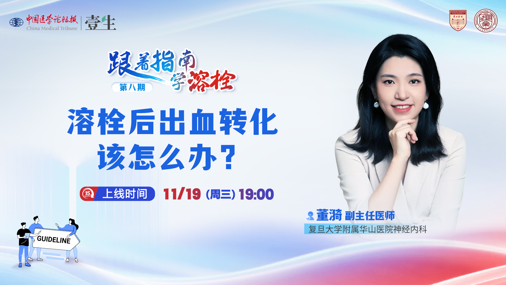 讲题:溶栓后出血转化该怎么办?讲者:董漪 副主任医师复旦大学附属华山医院神经内科本期内容1、溶栓后出血影像学分类有哪些?有何意义?2、如何降低溶栓后sICH风险?如何预测风险?3、脑微出血和溶栓后sICH之间有何关系?这类卒中患者如何处理?4、各类抗血小板治疗发生sICH的风险有区别吗?5、如何处理溶栓后出血转化?上线日期:11月19日(周三) 19:00