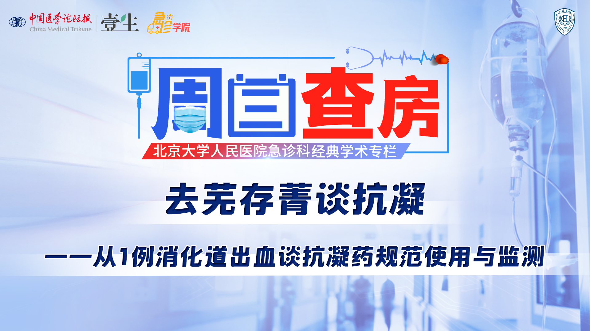 栏目介绍北京大学人民医院急诊科经典学术活动《周三查房》,自2020年11月起入驻中国医学论坛报·壹生急诊学院,经典病例结合急诊科核心知识点讲解,全部免费开放,供临床同道交流学习。更多内容,请安装壹生App,关注“急诊”频道。课程信息讲题:去芜存菁谈抗凝——从1例消化道出血谈抗凝药规范使用与监测讲者:武宁 医生讨论专家:董桂英,王煜冉等上线时间:11月26日(周三)温馨提示:微信搜索“壹生急诊学院”,关注后免费获得上课提醒,精彩内容不错过。