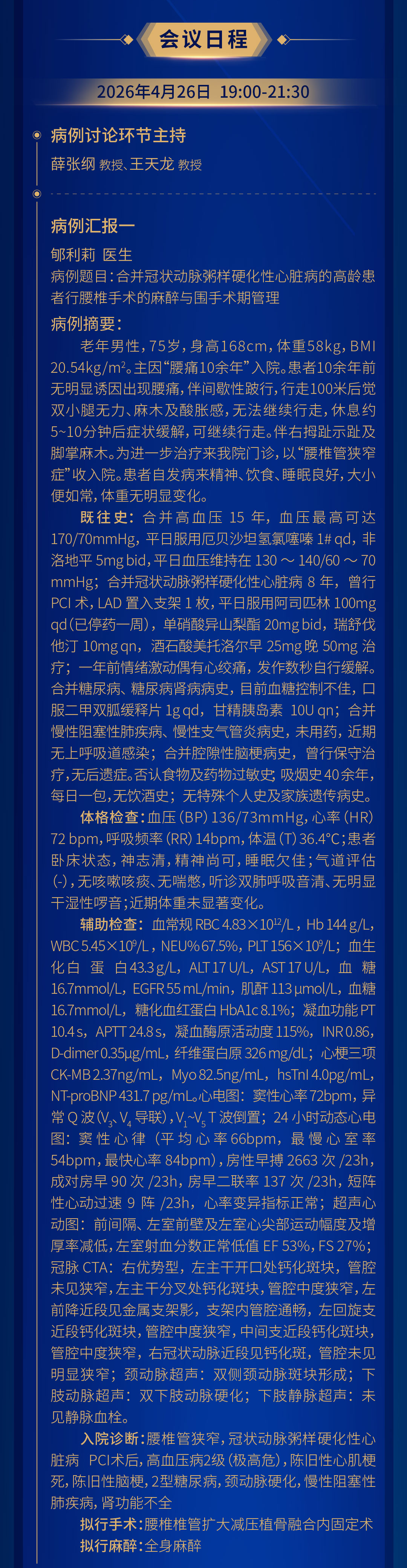 1.合并冠状动脉粥样硬化性心脏病的高龄患者行腰椎手术的麻醉与围手术期管理