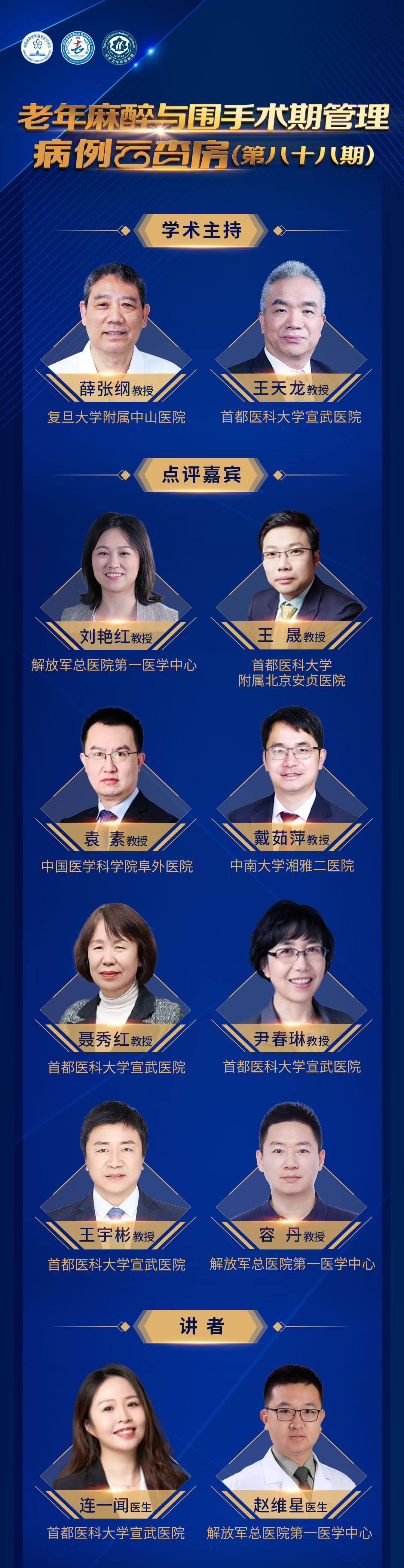【老年患者麻醉与围术期管理病例云查房】由中国老年学和老年医学学会、中国老年学和老年医学学会脑疾病分会、国家老年疾病临床医学研究中心(宣武医院)和国家老年麻醉联盟(NAGA)共同主办。
