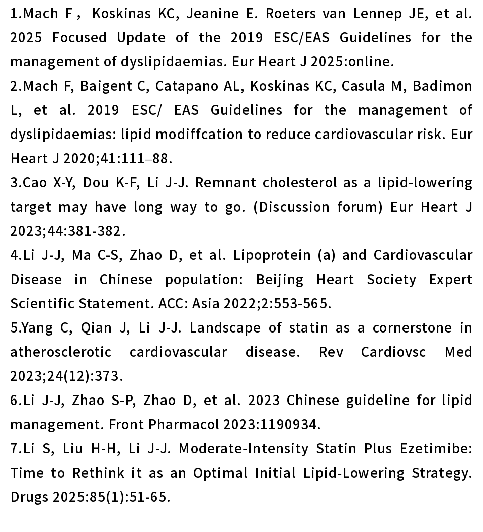 值得指出的是,《2025指南重点更新》多次、多处提及中等强度他汀类药物的应用,间接提示高强度他汀在国外的应用也有诸多现实问题,说明我们提出的中等强度他汀联合胆固醇吸收抑制剂应该成为理想的起始降脂策略是适宜合理的[7]。