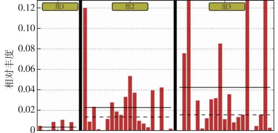 PSTR:腹膜溶质转运系数;组1:快速型PSTR组;组2:低平均转运组;组3:低转运组;每组内横向实线与虚线分别标识瘤胃球菌属亚群的相对丰度平均值与中位值
