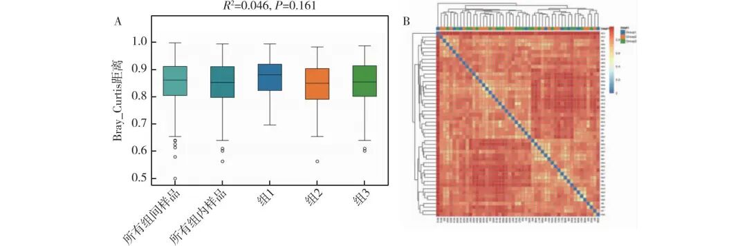 PSTR:腹膜溶质转运系数;组1:快速型PSTR组;组2:低平均转运组;组3:低转运组;以颜色梯度由蓝色到红色表示样品间Bray-Curtis距离由近到远