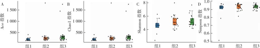 菌群α多样性与β多样性分析粪菌研究低转运组、低平均转运组和快速型PSTR组三组患者间菌群α多样性指标包括Ace指数、Chaol指数、Shannon指数和Simpson指数差异均无统计学意义;而Anosim箱型图与样品聚类热图显示三组间菌群β多样性差异也无统计学意义(图1、图2)。