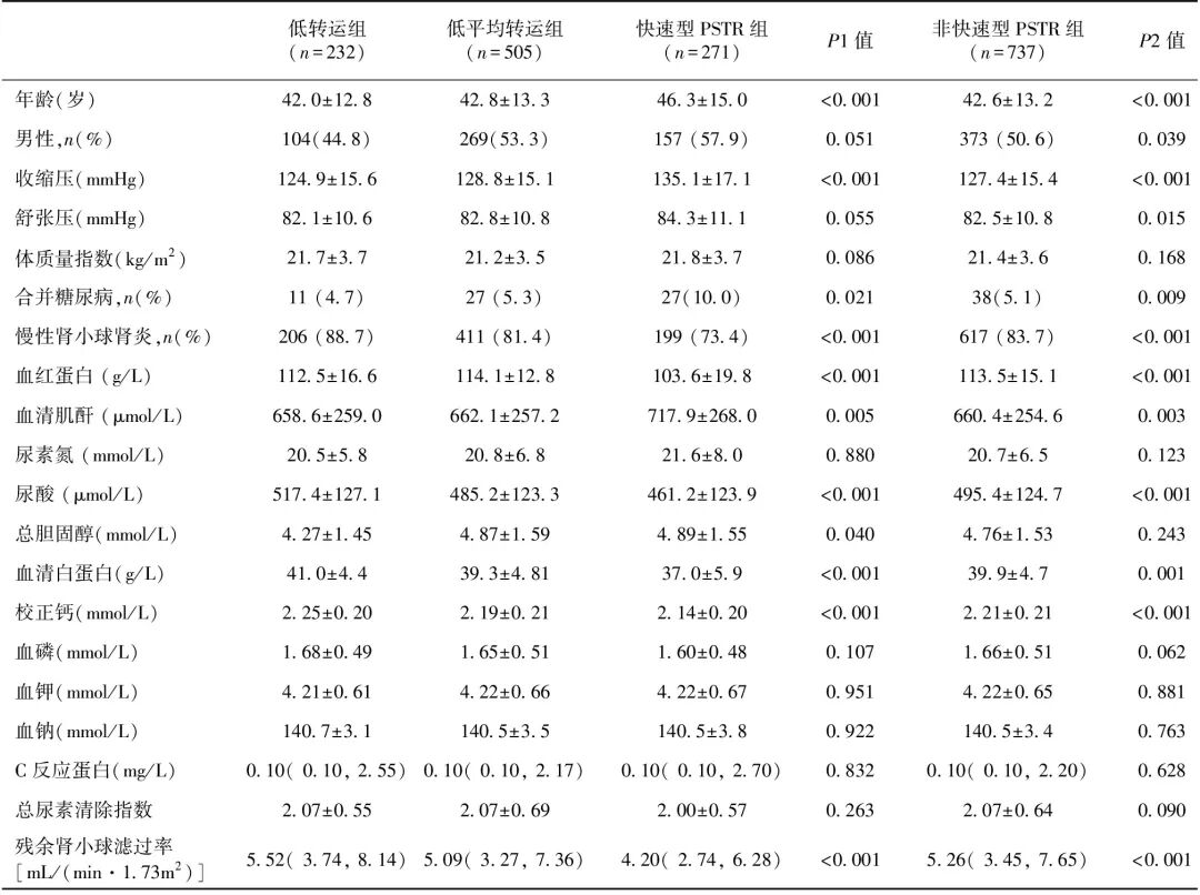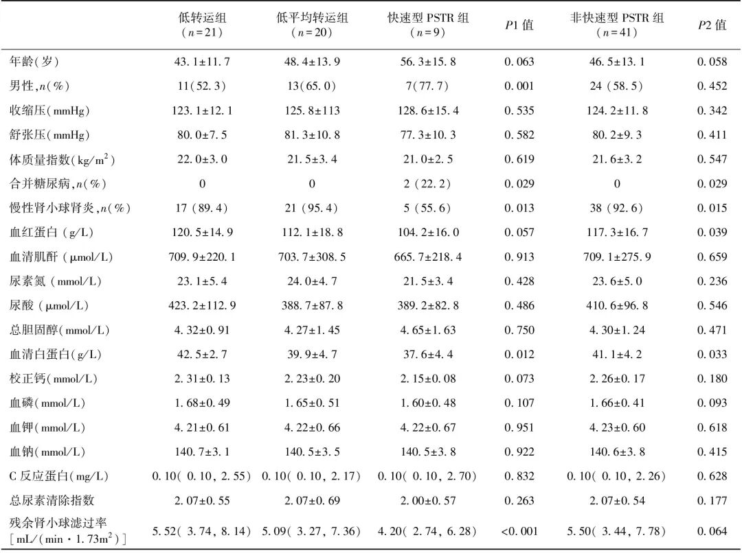PSTR:腹膜溶质转运系数;P1值:低转运组、低平均转运组和快速型PSTR组三组间比较;P2值:非快速型PSTR组与快速型PSTR组比较