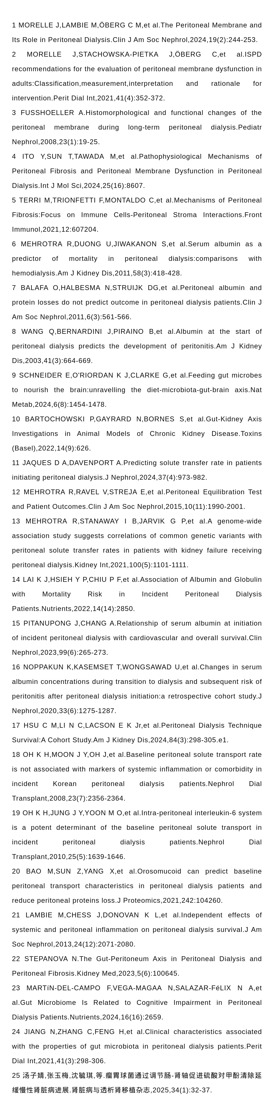 ABSTRACTObjective:To explore the predictive value of combining fecal microbiota 16sRNA high-throughput sequencing with serum albumin (Alb) for the fast peritoneal solute transport rate (PSTR) in PD patients.Methodology:In this center’s retrospective patient cohort (January 2004-January 2024),patients were divided into non-fast PSTR group and fast PSTR group based on the ratio of dialysate creatinine to serum creatinine from the first peritoneal equilibration test (PET) performed 30 days post-catheter insertion (D/Pcr=0.65).The ability of Alb to predict fast PSTR was analyzed using multivariate Logistic regression and receiver operating characteristic (ROC) analysis,and the external validation of Alb’s predictive capability was conducted using the PSTR empirical formula proposed by David,which includes parameters such as gender,race,Alb,and sodium.On the other hand,from May to October 2024,50 newly admitted PD patients were recruited,and the first PET was performed 30 days post-catheter insertion.Concurrently,fecal samples were collected,frozen at-80 ℃,and subsequently subjected to high-throughput sequencing of fecal 16S rRNA.Patients were classified into low transport group (D/Pcr≤0.49),low average transport group (D/Pcr 0.50-0.64),and fast PSTR group (D/Pcr≥0.65) based on the D/Pcr ratio.The differences in intestinal microbiota levels among the three groups were compared,and significant differential bacterial genera were identified using linear discriminant analysis,analyzing the discriminative value of differential genera combined with Alb for fast PSTR.Results:A retrospective cohort study included 1 008 patients with PD,among which the fast PSTR group accounted for 26.9%.Logistic regression analysis indicated that the variables independently associated with fast PSTR included systolic blood pressure,uric acid,Alb.Compared to other variables,the level of Alb had the largest area under the ROC curve for determining fast PSTR.The predictive ability of Alb was not statistically significantly different from that of the David formula[AUC 95%CI 0.636 (0.593-0.680) vs 0.629(0.589-0.670),P=0.480].The fecal microbiota study included 50 newly admitted PD patients,revealing statistically significant differences in Alb levels among the low transport group,low average transport group and fase PSTR group (P=0.012).However,there were no statistically significant differences in the α and β diversity of intestinal microbiota among the three groups.The composition of the microbiota showed no statistically significant differences at the phylum,class,order,and family levels,but significant differences were observed at the genus and species levels.Linear discriminant analysis revealed that the relative abundance of the genus Ruminococcus in the low transport group was significantly higher than that in the fast PSTR group (P=0.018).Correlation analysis indicated a negative correlation between the relative abundance of Ruminococcus and D/Pcr levels (r=-0.351,P=0.013).The DeLong test demonstrated that the relative abundance of Ruminococcus significantly improved the predictive value of Alb for fast PSTR determination[AUC 95%CI 0.871 (0.733-0.979) vs 0.725(0.554-0.895),P=0.04]; the predictive capability of fecal bacteria combined with Alb was also significantly superior to that of the David formula[AUC 95%CI 0.668(0.475-0.860),P<0.001]. Conclusion:Serum Alb levels are independent predictors of peritoneal solute transport function in patients with PD.The relative abundance of Ruminococcus species derived from fecal 16S rRNA high-throughput sequencing,when combined with Alb levels,can significantly enhance the predictive value of the latter in determining the fast PSTR.