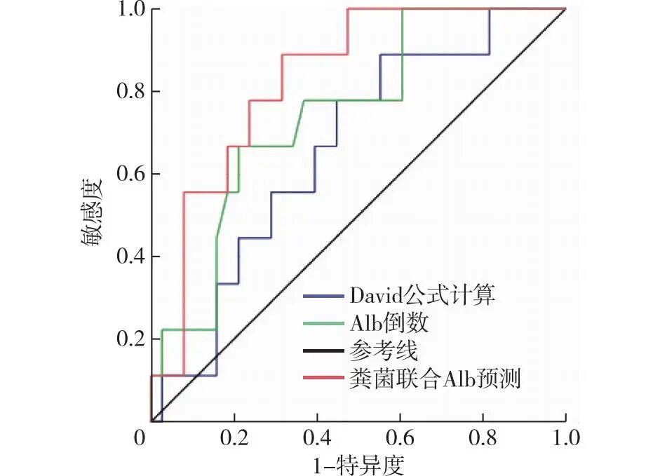 瘤胃球菌相对丰度与Alb联合判定快速型PSTR的预测价值 DeLong检验显示,瘤胃球菌属水平相对丰度与Alb联合显著改善Alb判定快速型PSTR的预测价值[AUC 95%CI 0.871(0.733~0.979) vs 0.725(0.554~0.895),P=0.04]。此外,粪菌联合Alb预测能力也显著优于David公式[AUC 95%CI 0.668(0.475~0.860),P<0.001](图4)。