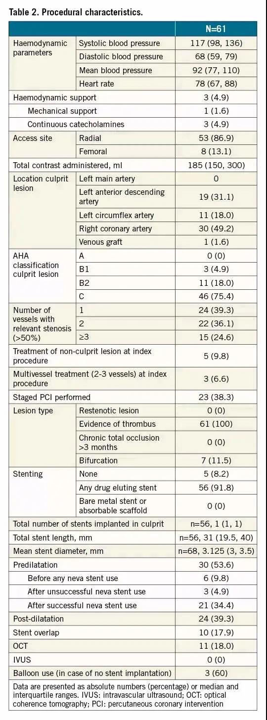 14例(23%)患者发生不影响血流和可逆的冠脉痉挛。1例患者(第10例患者)发生分支栓塞,采用了台面模型的结合负压抽吸技术成功抽出。然后(第11例患者开始)这种台面下的技术应用到随后的51例患者。没有发生与器械相关的其他并发症。在NeVa使用后,TIMI血流<3级者从基线68.3%下降至10.3%(P <0.001),MBG <2者从基线65%降到27.6%(P <0.001),TTG≥3者从基线96.7%降到43.2%(P <0.001)。