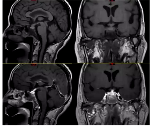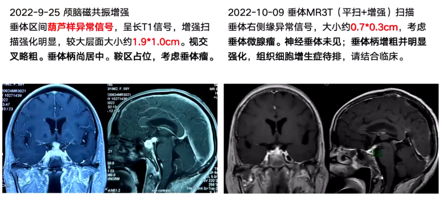 外院头颅MRI:检查显示,9月23日平扫见鞍区及鞍上占位性病变;9月25日增强扫描见垂体区葫芦样异常信号,强化明显,大小约1.9cm×1cm,视交叉略增粗,垂体柄居中,考虑鞍区占位,初步考虑垂体瘤。