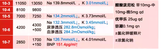 糖皮质激素治疗后,患者出入量发生变化,出现多尿症状,考虑中枢性尿崩症,检测血尿渗透压,结果符合中枢性尿崩症诊断。指南推荐去氨加压素口服治疗,起始剂量50μg,根据血钠浓度调整剂量。治疗过程中,根据患者情况调整醋酸泼尼松剂量,加用优甲乐25μg及氯化钾缓释片维持电解质平衡。