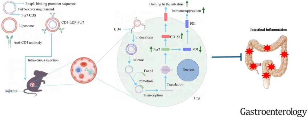 通过CD4-LDP-Fut7纳米载体特异性上调Fut7在Tregs中的表达,促进Tregs产生CD15s并降低PD1水平。该过程增强了Tregs的肠道归巢和免疫抑制功能,从而有效缓解肠道炎症。