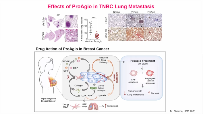 生存数据方面,单独使用ProAgio即可显现出很强的生存优势。而ProAgio联合紫杉醇或Gem对生存率的改善更明显。同时,在对胶原蛋白进行染色后发现,胶原蛋白的数量有明显降低,血管渗漏减少,而灌注有所增加。这些表现与Proagio在PDAC中的表现类似,即Proagio也可增加乳腺癌中的dFdCTP含量、提高dFdc/dFdU比率、增加药物输送并减少肿瘤缺氧程度,而且Proagio对于三阴性乳腺癌的肺转移也有很好的抑制作用。
