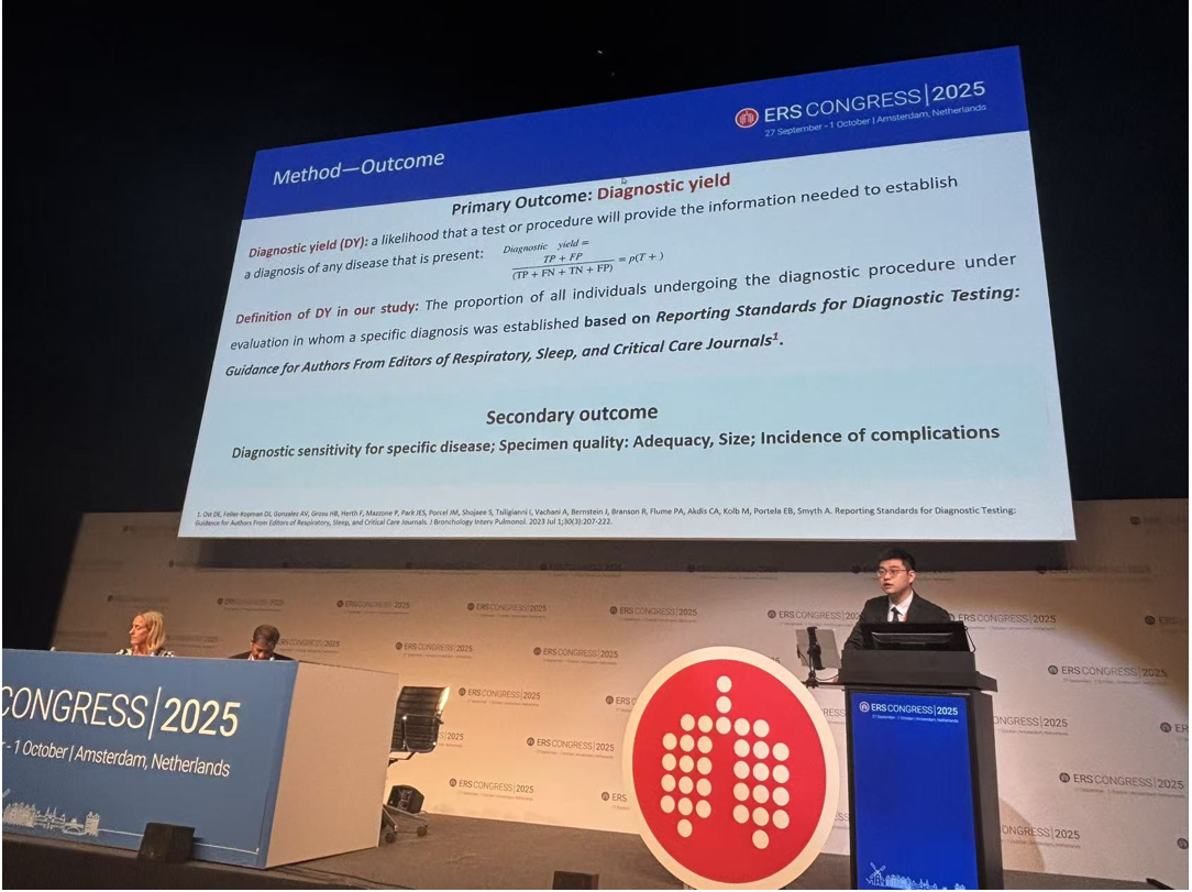 在9月28日9:30(阿姆斯特丹时间)举行的 Future bronchoscopic interventions学术版块中,郑子文博士研究生代表团队作了题为 “Endobronchial ultrasound-guided transbronchial mediastinal cryobiopsy via a tunnel for diagnosing non-metastatic lymphadenopathy: a multicenter randomized controlled trial” 的口头发言。