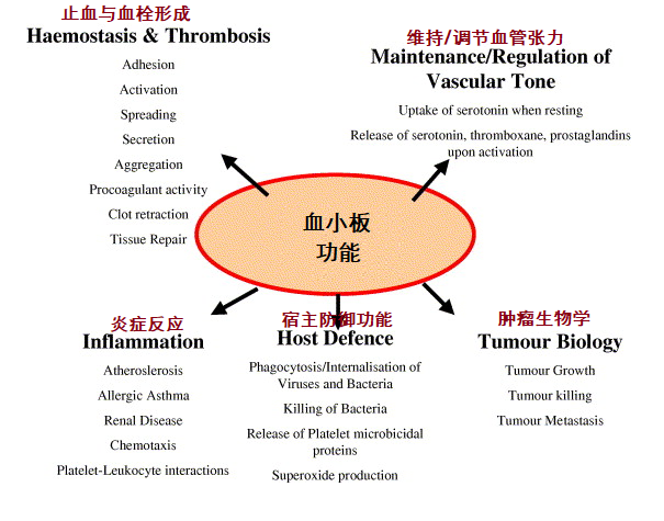 此外, 血小板还参加多种疾病的病理过程, 包括感染后的炎症反应、肾脏疾病、肿瘤发生发展、糖尿病、血栓性疾病等等。