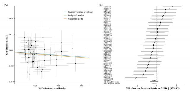 孟德尔随机化结果评估谷物摄入量对抑郁症的因果关系