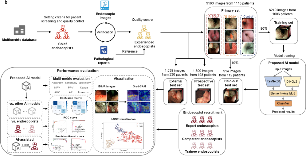 图2.用于实现食管胃交界腺癌(EGJA)的分期诊断的AI模型的开发与评估过程