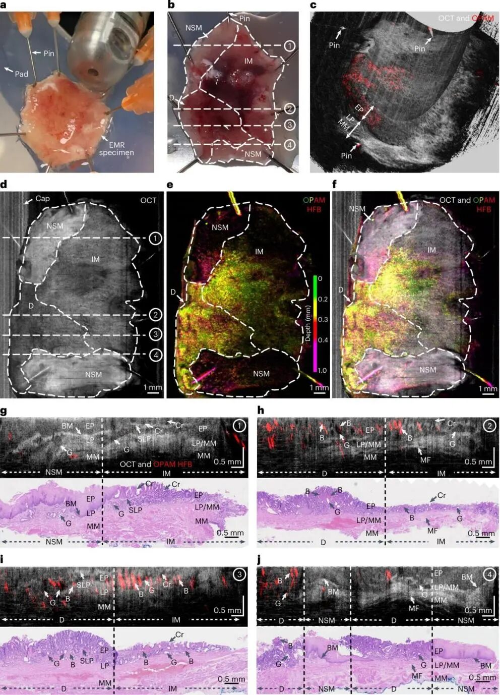 在对10例BE患者的14份切除标本进行验证时,研究者发现在单一使用OCT图像进行分类时,分辨高级别病变仍存在较低灵敏度,而融合OPAM后的O2E系统对肿瘤性病变的识别能力发生质变:其在ROI层面的灵敏度和特异性分别达到91%和94%,在患者层面更是高达94%和100%,该混合成像模式表现出的灵敏度与特异性均显著提升,显示出充分的潜力,但其临床验证数据尚不足以直接与现有指南推荐标准对比。通过同步捕捉黏膜微结构紊乱与肿瘤相关新生血管形态,该技术有望在未来大幅降低BE随访中的随机活检需求,推动早癌诊断从“经验性观察”向“定量化物理诊断”转型。