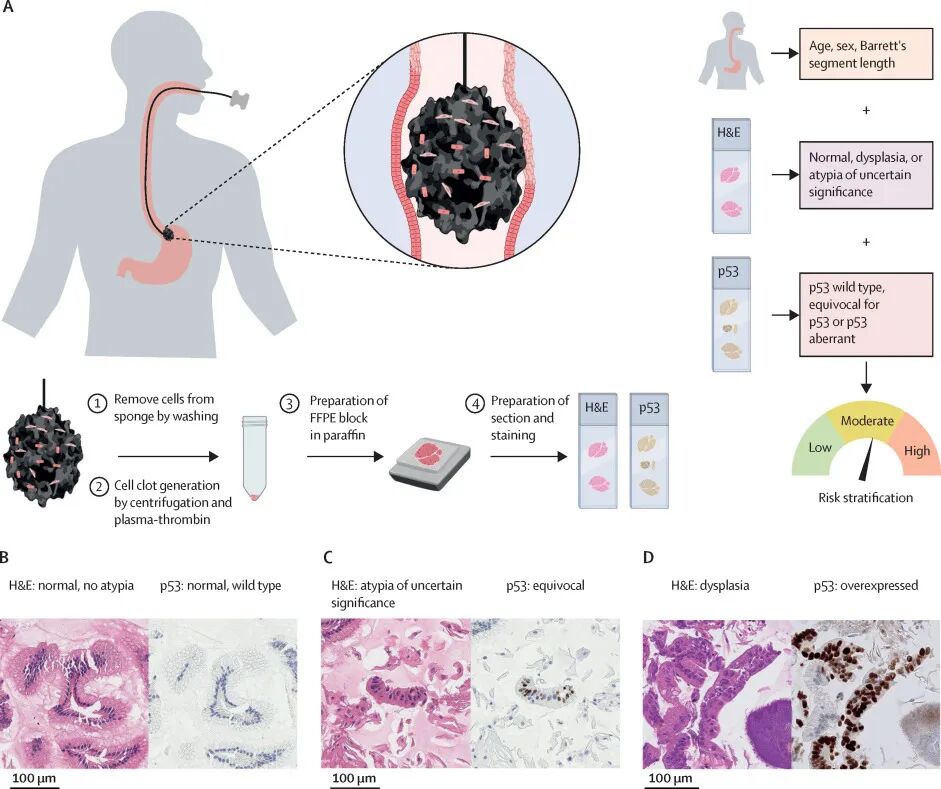 该研究系统评估了基于胶囊海绵取样(Cytosponge)结合分子标志物检测的非内镜风险分层策略(图5),旨在通过非侵入性途径对Barrett食管患者进行精准风险分类,以优化内镜资源的配置、提高早期病变检出率并降低不必要的侵入性检查需求。