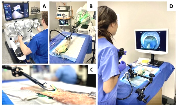 图6.机器人辅助内镜系统示意(A:医生操作台;B:患者端柔性内镜设备;C:可更换的内镜器械与摄像系统;D:传统ESD的手术操作示意)