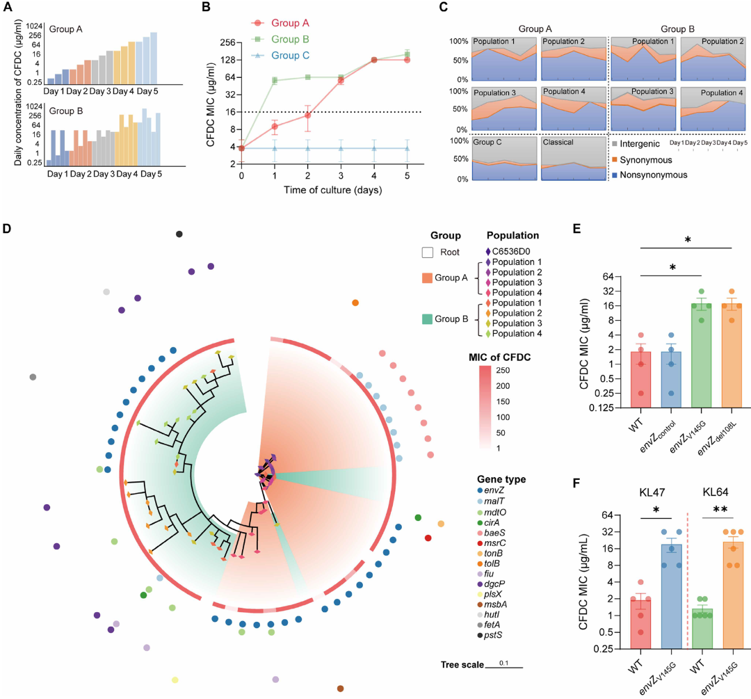 1.极速适应与“少数派”耐药:在波动的CFDC暴露下,肺炎克雷伯菌群体迅速获得了耐药性。但令人震惊的是,全基因组测序显示,真正发生基因突变的耐药克隆在演化后的总群体中仅占极小一部分,绝大多数细菌依然是基因型上的“敏感株”。