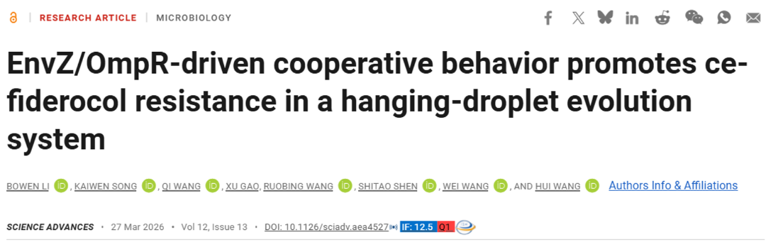 2026年3月27日,北京大学人民医院检验科与北京大学集成电路学院团队合作的研究发表在国际学术期刊Science Advances,题目为“EnvZ/OmpR-driven cooperative behavior promotes cefiderocol resistance in a hanging-droplet evolution system”。