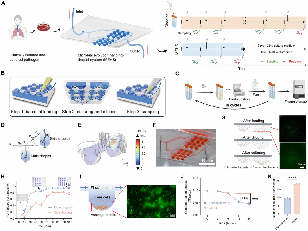针对上述工程痛点,医工交叉团队联手打造了一项极其巧妙的平台技术革新——MEHS。该方法摒弃了传统的封闭微通道,采用重力驱动流体技术在开放式的悬滴中进行细菌培养。