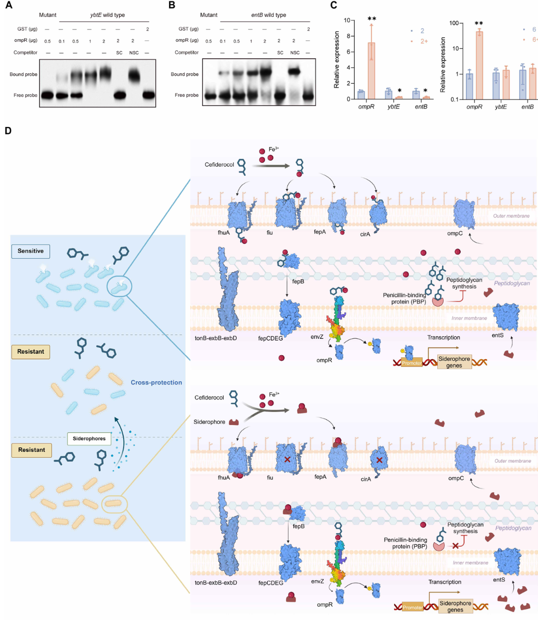 4.铁载体通路的重编程与群体“合作行为”:EnvZ/OmpR的突变导致了细菌铁载体生物合成途径的转录重配。这极少数的耐药突变株通过改变铁载体的代谢,竟然为周围原本脆弱的敏感亚群提供了强大的交叉保护。
