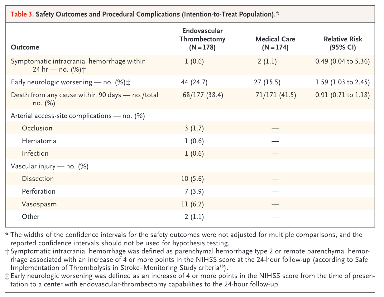 研究中发生症状性颅内出血的患者较少,血管内治疗组仅1例(0.6%),药物治疗组中2例(1.1%),两者差异无统计学意义;血管内治疗组5例(2.8 %)出现脑实质血肿,药物治疗组3例(1.7%)(RR 1.63,95% CI 0.39~6.73。接受血管内治疗的患者更有可能发生早期神经功能恶化(25% vs 16%,RR 1.59,95% CI 1.03~2.45),可能与梗死后水肿有关;但死亡率方面,血管内治疗组在数值上稍低,但与药物治疗组相比无统计学差异(38% vs 42%)。