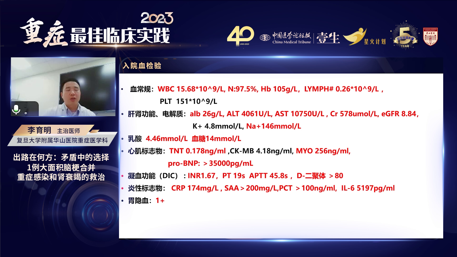 此例患者初始血小板计数正常,结合消化道出血病史,虽主要处于高凝状态,但一开始选择肝素进行体外抗凝,过程中患者出现血小板下降,基于高凝状态更换为阿加曲班,然而又继发脑出血,最终选择新型的萘莫司他。萘莫司他通过抑制凝血酶和凝血因子等途径发挥作用,半衰期较短,对全身凝血功能影响较小,体外抗凝维持APTT在1.5到2倍可达到良好抗凝效果,全身并发症也较少。经过抗感染治疗及全身脏器功能支持,特别是有效的肾脏替代支持,患者病情最终趋于好转,意识状态改善,肾功能恢复后无需长期透析治疗。
