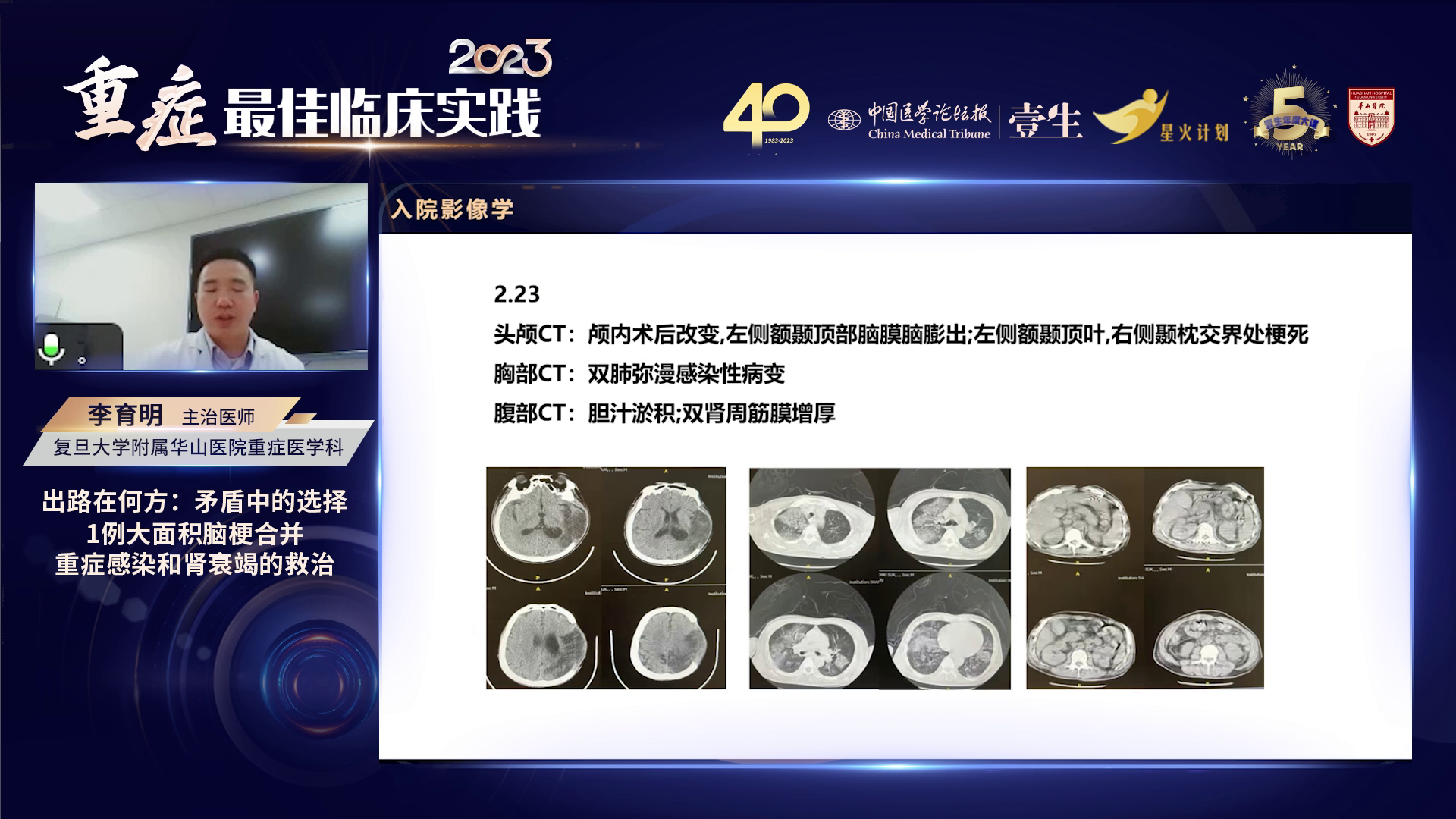 有高血压、心肌梗死、房颤病史,2月前因大面积脑梗死行去骨瓣减压及VP分流术,还有长期吸烟史。