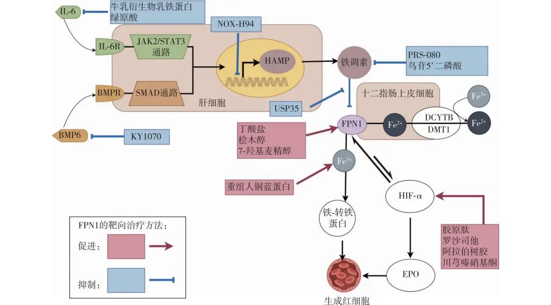 铁调素/FPN1轴作为全身铁稳态的核心调控信号轴,在肾性贫血患者体内其表达水平呈现上升趋势。鉴于铁调素在铁稳态调节中发挥关键作用,其已成为肾性贫血治疗策略中的主要靶点(图2)。