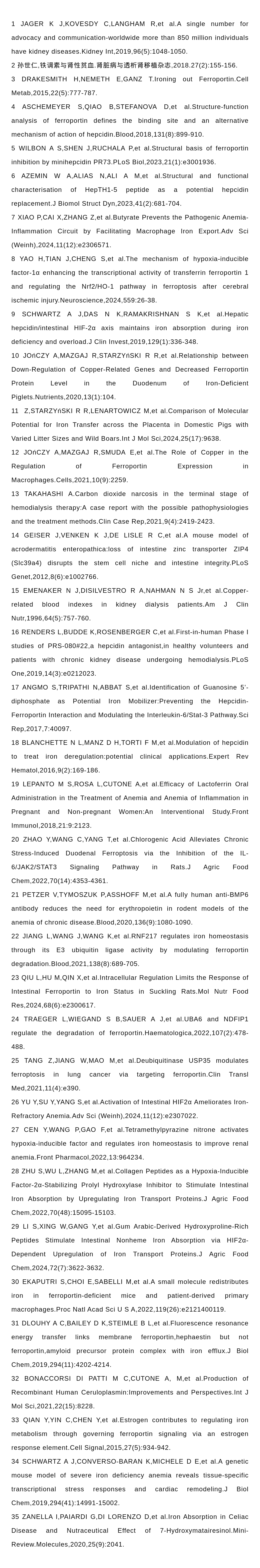 锌与铜存在相互作用[15],二者通过不同机制共同调控铁稳态:一方面,二者直接影响铁转运蛋白的表达和功能;另一方面,二者通过铁调素/FPN1信号轴和亚细胞定位机制,形成金属相互作用体系。上述发现为肾性贫血的精准治疗提供了新的理论框架,凸显铜、锌等二价金属离子在铁稳态病理生理中的重要作用。