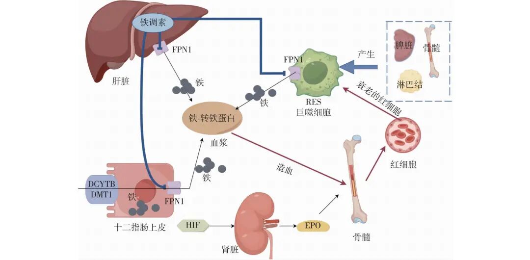 FPN1:膜铁转运蛋白1;DCYTB:十二指肠细胞色素B;DMT1:二价金属转运体1;RES:网状内皮系统;EPO:促红细胞生成素;HIF:缺氧诱导因子