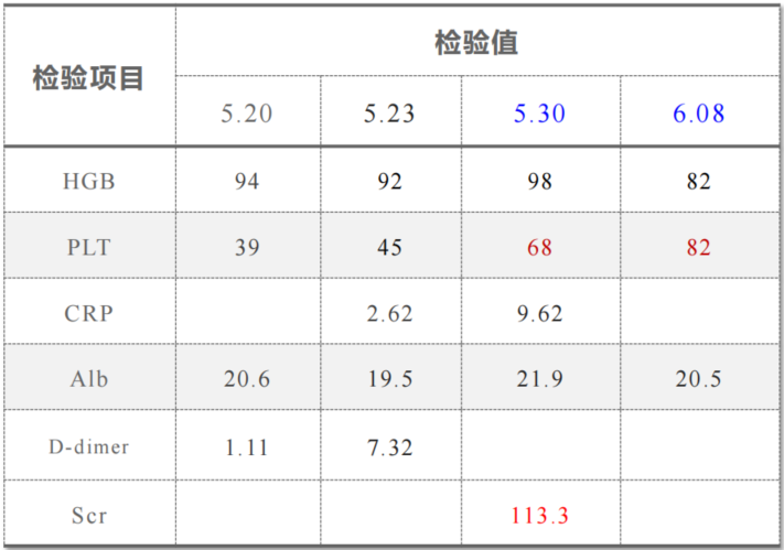 5.23 血常规:WBC 8.72×109 /L ,Hb 92g/L ↓ ,PLT: 43×109 /L ↓ CRP: 9.62mg/L; D-dimer:7.32mg/L ↑