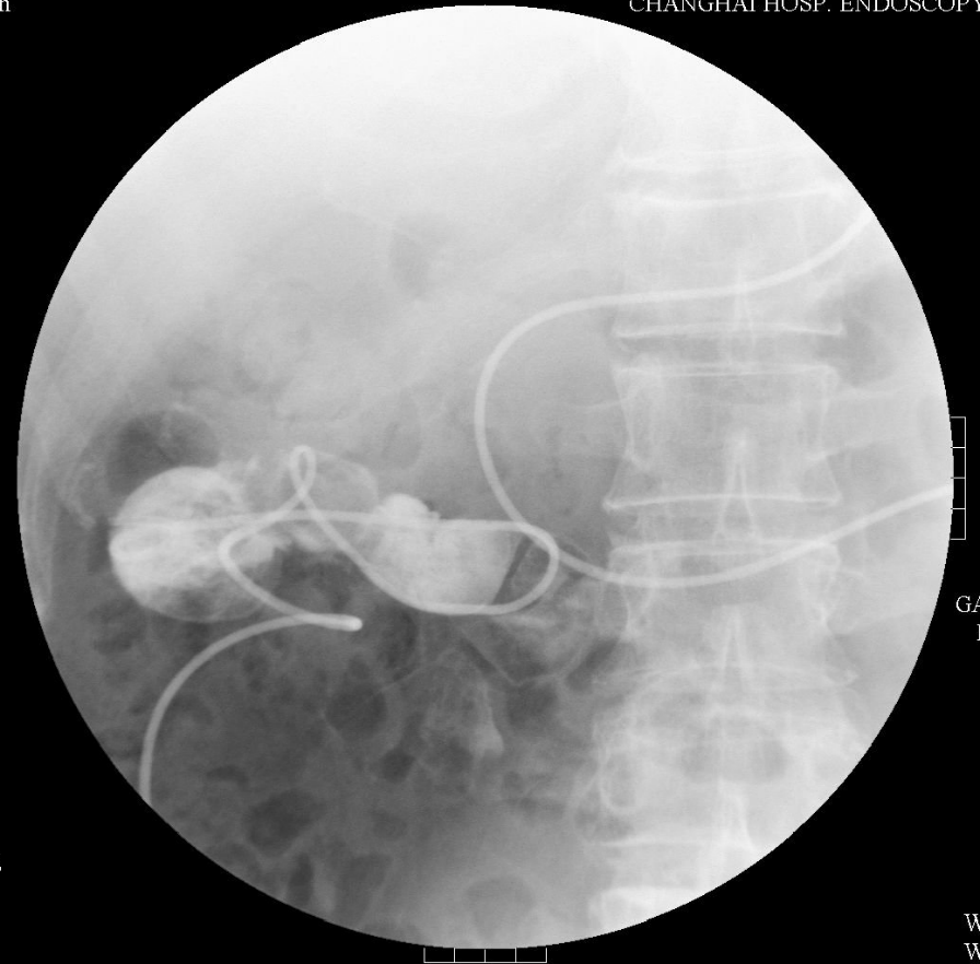 半个小时后,片子出来了,猪尾鼻胆管已脱出胆道,位于空肠(图1),透视下缓慢回拉无移动。