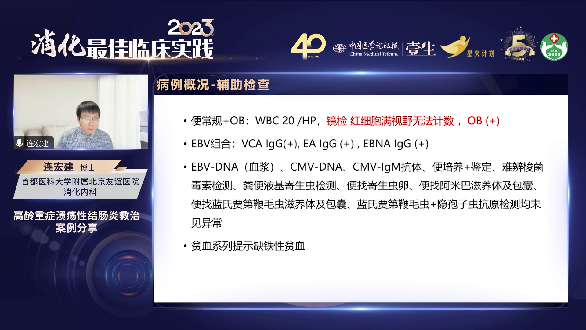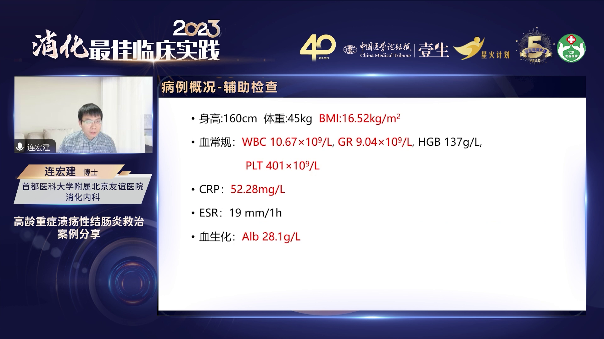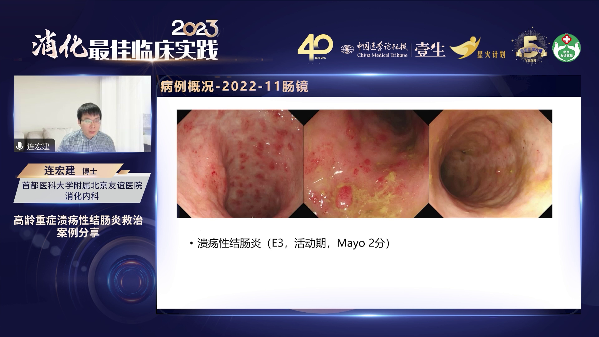 2) 急性重症溃疡性结肠炎的诊疗参考:参考Truelove-Witts标准,血便大于6次/天、心率大于90次/分、体温>37.8℃、血红蛋白<10.5 g/dL、ESR>30 mm/h及CRP升高有助于诊断急性重症溃疡性结肠炎。此类患者预后差,病死率高,手术比例可达20%~30%。诊断后应尽早治疗、评估,药物效果不佳时及时调整,全程考虑手术可能并与外科及时沟通。文献推荐一旦确诊,立即起始糖皮质激素治疗,第4天评估,效果良好继续治疗,效果有限则考虑生物制剂如英夫利西单抗或免疫抑制剂如环孢素、他克莫司,再次评估后决定维持治疗或手术。但该文献未针对老年人群,高龄患者还需考虑一般状况、合并症及药物不良反应等因素。