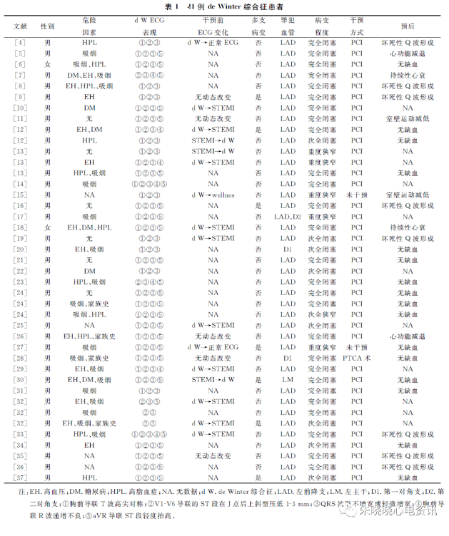 以“de Winter syndrome”、“de Winter pattern”、“de Winter综合征”为关键词分别在PubMed、中国知网、中国万方数据库中进行文献检索,时间为2008年-2021年,去除重复及资料不完整的病例,共纳入34篇文献共报道41例de Winter综合征患者(见表1)。