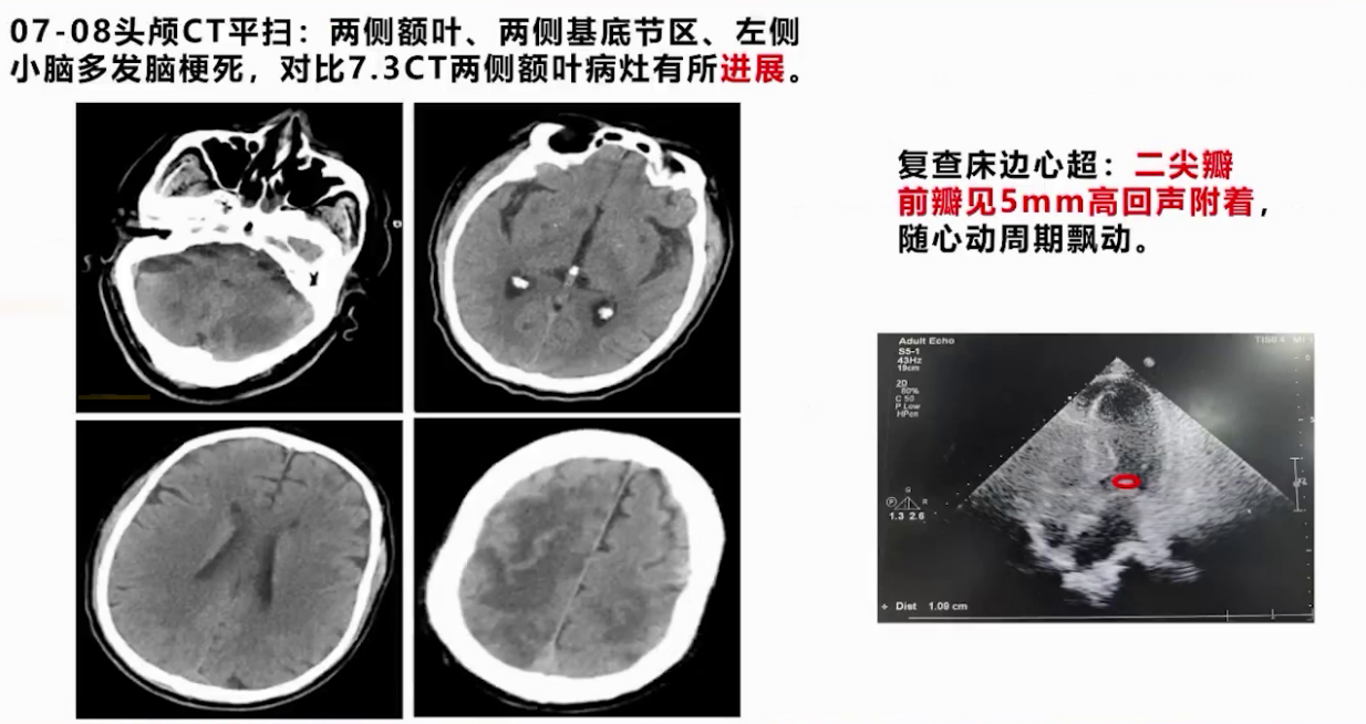 入院第5天复查,头颅CT发现两侧额叶基底节区和左侧小脑多发梗死灶,较前明显进展;床旁心脏超声发现在二尖瓣有5毫米赘生物随心动周期飘动,考虑颅内栓塞是心内膜炎感染引起的菌栓脱落所致。