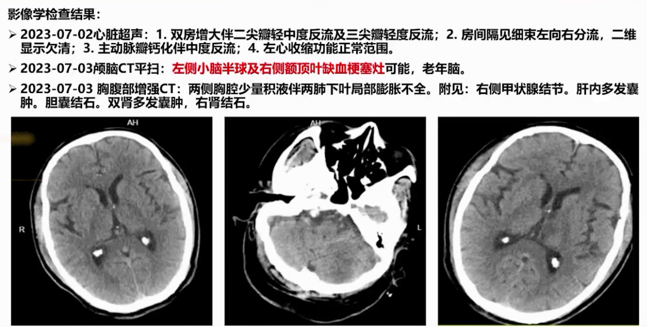心超复查显示双房增大,二尖瓣中度反流,三尖瓣轻度反流,房间隔可见细小左向右分流,主动脉瓣可见钙化、中度反流。头颅CT平扫示左侧小脑半球和左侧额顶叶缺血梗死灶可能,胸腹部CT未见明显炎性和栓塞病灶。此时,颅内栓塞来源(房颤血栓或心内膜炎菌栓)尚无法确定,因心内膜炎诊断不明确。