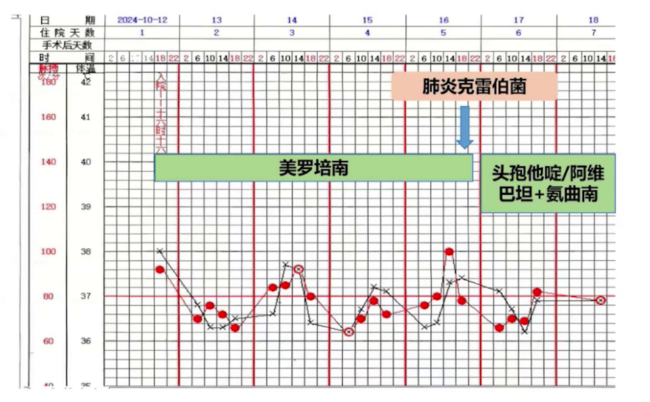 患者两月余前突发胸痛、胸闷、气短,在A医院确诊为急性心肌梗死,接受冠脉支架植入术后转入ICU治疗,后症状缓解出院。出院当日开始低热,体温最高37.7℃,之后胸闷气短加重,于B院诊断为新冠感染,血培养提示耐碳青霉烯的肺炎克雷伯菌,经对症治疗后出院。一周前患者再次发热,体温最高达39.2℃,伴有寒战、咳嗽咳痰,自行服药效果不佳,遂来我院。血常规示白细胞正常,中性粒细胞百分比75.1%,PCT 1.52ng/mL,CRP 56mg/L,胸部CT显示双肺水肿伴右肺下叶感染性病变及双侧胸腔积液,腹部CT提示前列腺增生伴囊性灶,诊断为脓毒症。当地医院予比阿培南联合阿奇霉素抗感染等治疗,症状无明显改善,转院前复查炎症指标升高,患者遂至我院急诊,以脓毒症收入院。