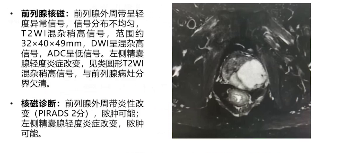 患者存在尿痛症状,尿常规白细胞持续阳性,结合全国细菌耐药监测网数据,老年男性需警惕隐匿部位感染,虽入院时泌尿系超声未见异常,但详阅外院CT片发现前列腺可疑囊性灶,进一步行前列腺MRI检查,考虑前列腺外周带炎性脓肿及左侧精囊腺脓肿可能。对前列腺脓肿进行穿刺引流,共引流200ml脓液,脓液培养与血培养结果一致,均为产超广谱β-内酰胺酶的耐碳青霉烯类肺炎克雷伯菌,穿刺后患者炎症指标明显下降,治疗效果良好,确定前列腺脓肿为脓毒症的元凶。