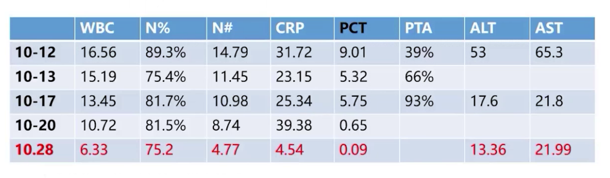 实验室检查:炎症指标显著升高,凝血功能异常,心肌标志物肌钙蛋白轻度升高,尿常规白细胞每高倍视野15-20个。痰培养提示鲍曼不动杆菌,结核菌、细菌、真菌涂片阴性,尿培养阴性,病毒相关检测提示既往感染,免疫指标无明显异常。