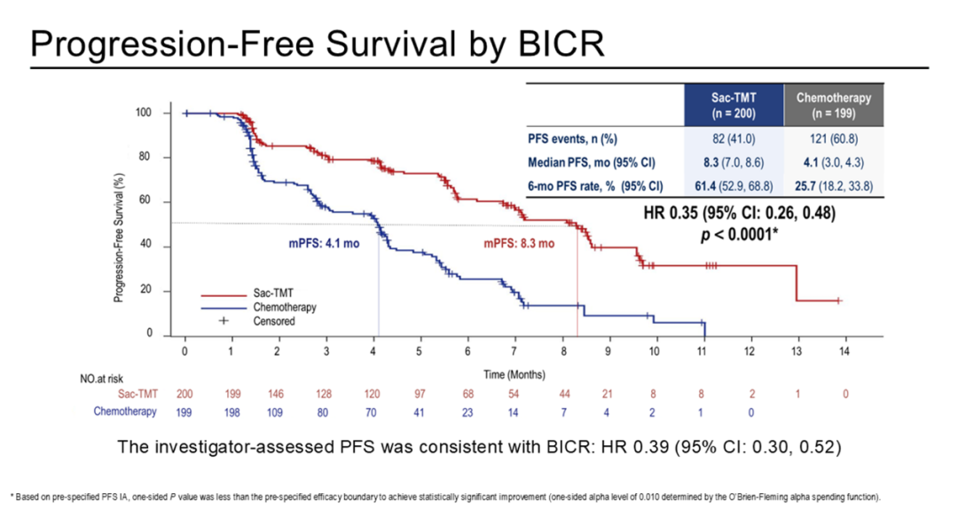 研究结果显示,芦康沙妥珠单抗在主要终点PFS方面展现出显著优势。芦康沙妥珠单抗组的中位PFS达到8.3个月,而化疗组仅为4.1个月(HR=0.35;95% CI:0.26-0.48;P<0.0001)。6个月PFS率在芦康沙妥珠单抗组为61.4%,较化疗组的25.7%显著提升,提示该药物能更早、更持久地为患者带来疾病控制。在肿瘤缓解方面,芦康沙妥珠单抗组确认的ORR高达41.5%,显著优于化疗组的24.1%,直接证明了该药物强大的肿瘤杀伤能力。尽管总生存期数据尚待最终成熟,但早期分析显示的强烈获益趋势令人鼓舞(HR=0.33;95% CI:0.18-0.61),为其潜在的长期生存改善提供了有力信号。