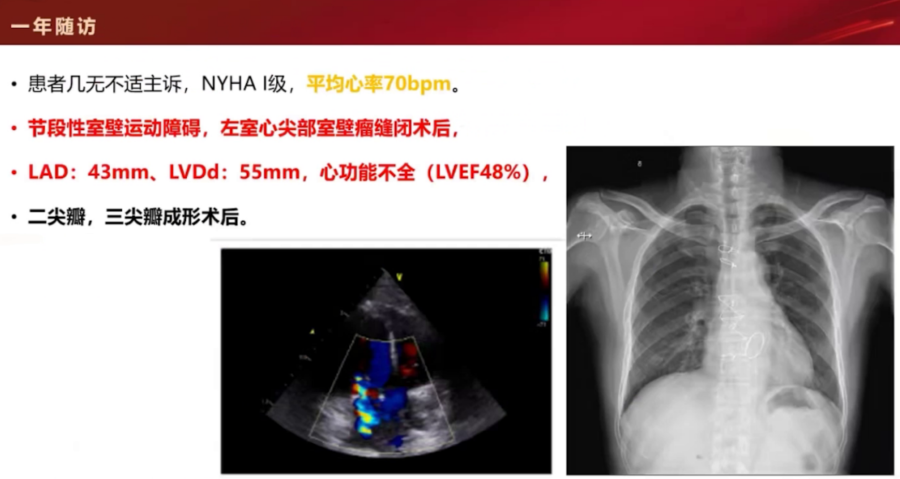 术后1年心功能纽约分级Ⅰ级,LVEF 48%,NT-proBNP 770 pg/mL。