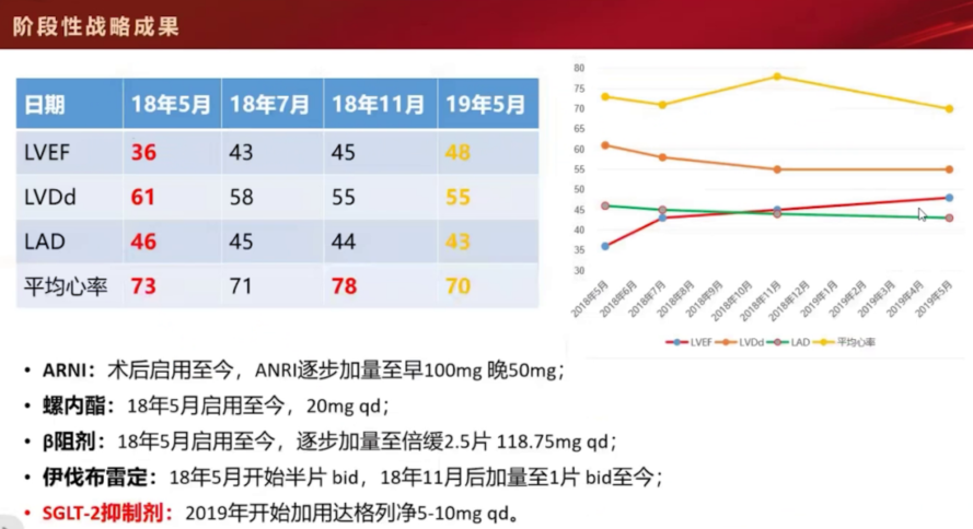 多学科团队行外科手术:室壁瘤封闭术+二尖瓣、三尖瓣瓣环成形术+冠状动脉旁路移植术(对角支)。术后药物治疗调整为诺欣妥(沙库巴曲缬沙坦)、伊伐布雷定、螺内酯、达格列净等,并逐步滴定至目标剂量。