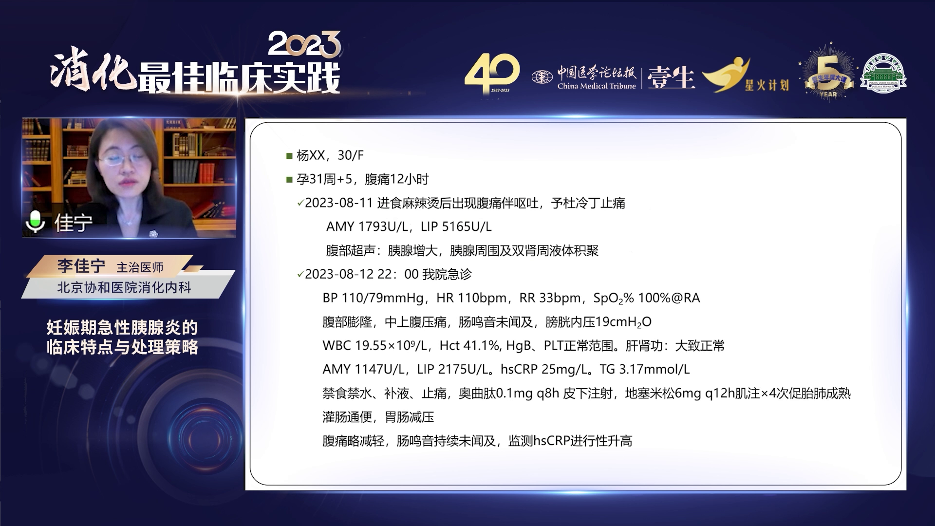 过去20年,协和医院急性重症胰腺炎病死率明显下降,得益于理念更新,包括准确分类给予相应支持、早期液体复苏、尽早肠内营养,以及合适处理局部和全身并发症。急性胰腺炎初始治疗及入院最初24小时是黄金治疗时间,6-24小时是最重要治疗窗。