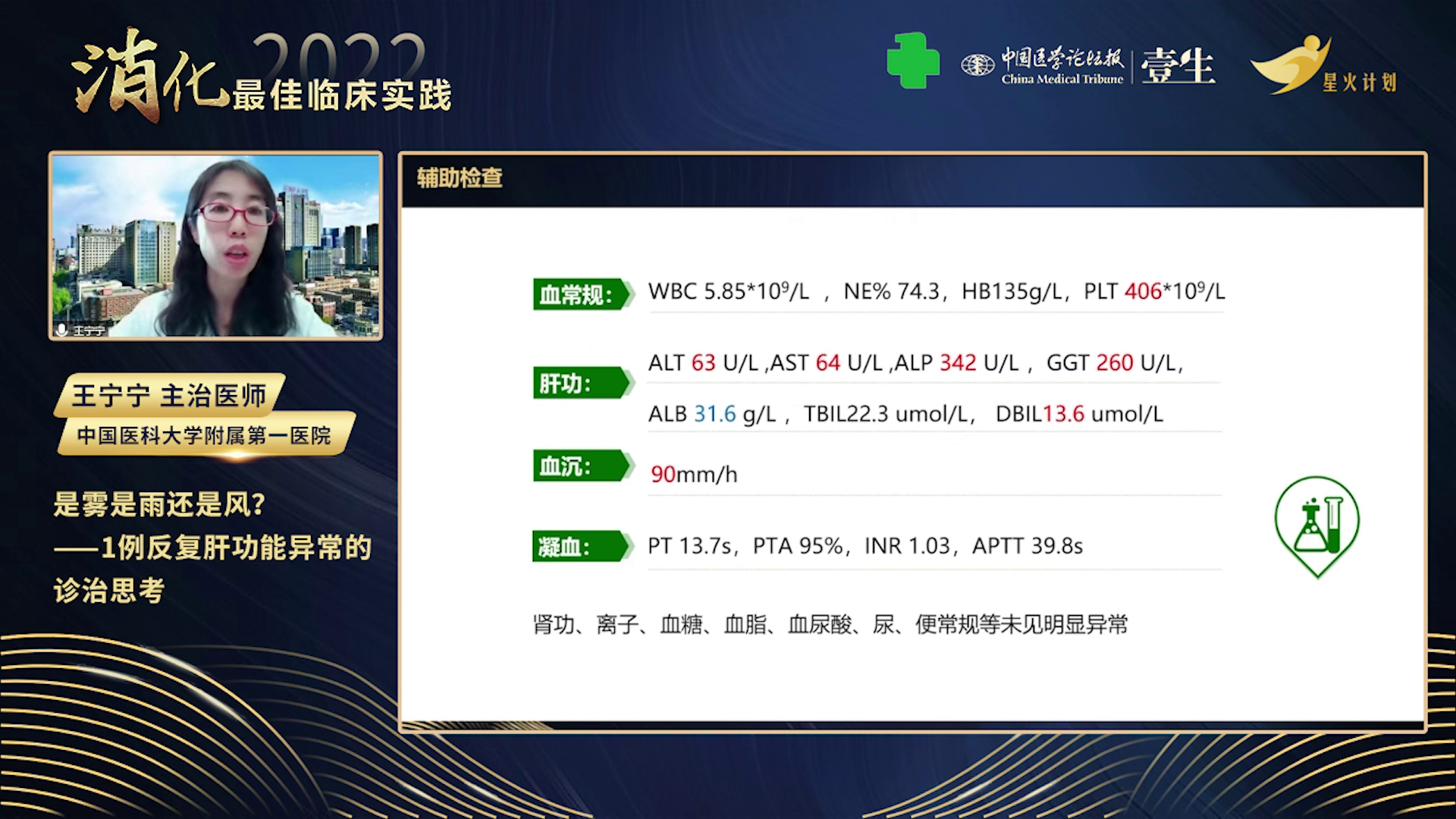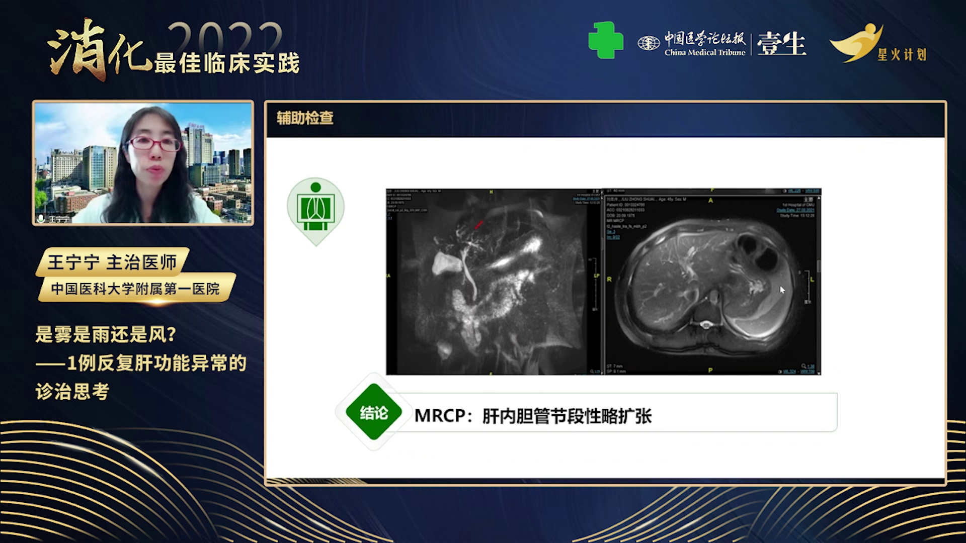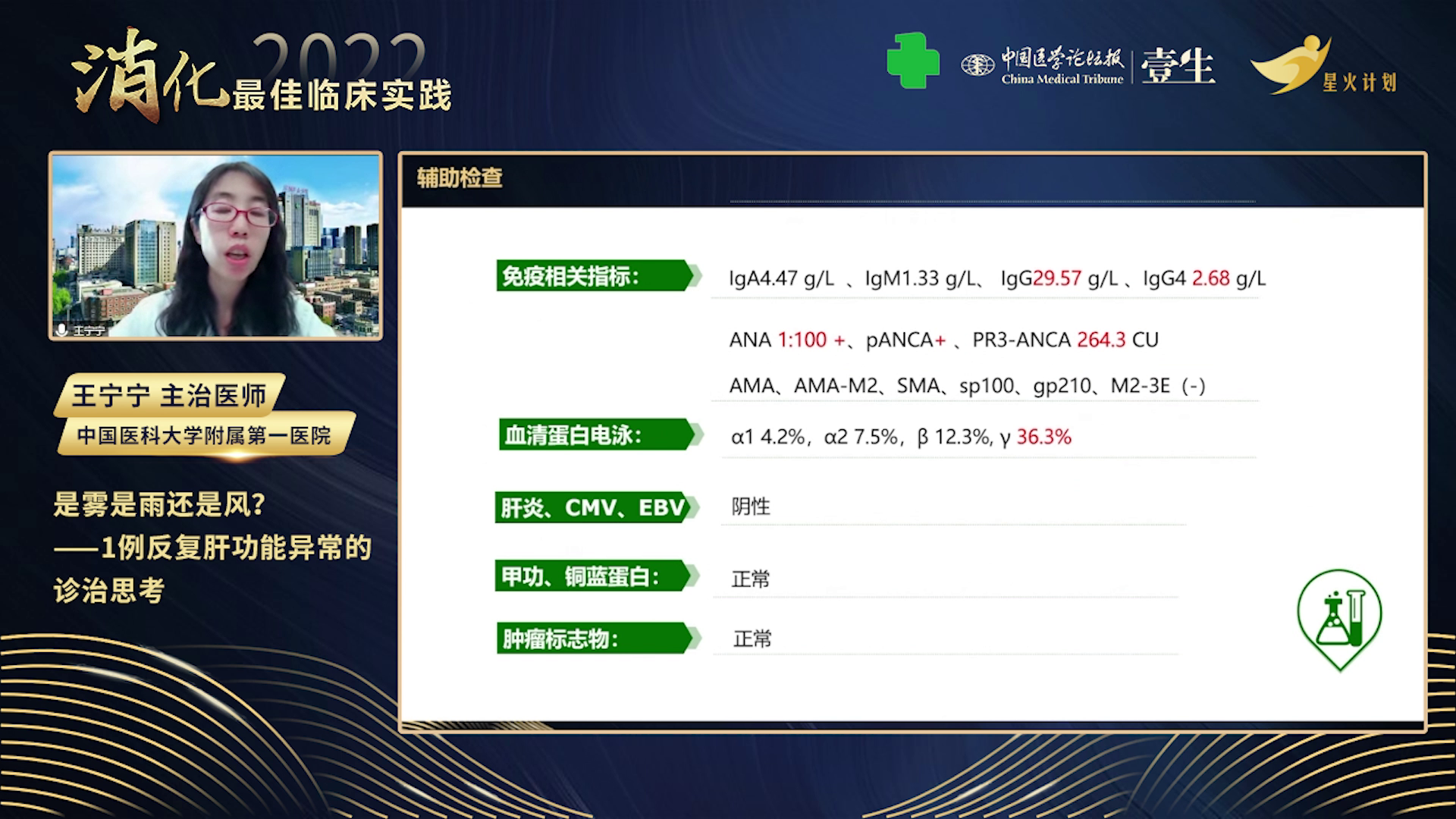 2015年12月就诊于我院,复查肝功能:ALT 254 U/L,AST 93 U/L,ALP 526 U/L,GGT 1071 U/L,胆红素正常,IgG轻度增高19.9 g/L,ANA 1:80阳性,MRCP提示肝左叶肝内胆管轻度扩张,考虑自身免疫性胆管炎,予熊去氧胆酸、异甘草酸镁等保肝治疗,10天后复查肝功能明显好转,谷丙转氨酶及谷草转氨酶降至正常,碱性磷酸酶和γ-GT降约一半,胆红素正常,之后继续熊去氧胆酸口服出院。2016年因肝功能异常于北京某医院住院,肝穿提示免疫相关性胆管炎,但未找到报告,北京医院建议继续熊去氧胆酸口服,此后肝功能仍异常。2018年于我市某医院复查,四个转氨酶均增高,ANA 1:80阳性,ANCA阳性,IgG及IgM正常,再次肝穿仅提示慢性炎症性改变(G1/S0-1),局灶可疑具有不典型的重叠综合征(PBC与AIH),建议尝试激素治疗,患者拒绝,仍继续熊去氧胆酸0.25g tid口服,此后多次复查肝功仍异常。直至2021年8月25日,因肝功能持续异常(ALT 78U/L,AST 77U/L,ALP 271U/L,GGT 387U/L)再次就诊于我院消化内科住院治疗。病来有乏力,间断大便不成形,便次增多至3-4次/日,无黏液脓血及明显腹痛,精神、饮食、睡眠正常,体重无明显变化。