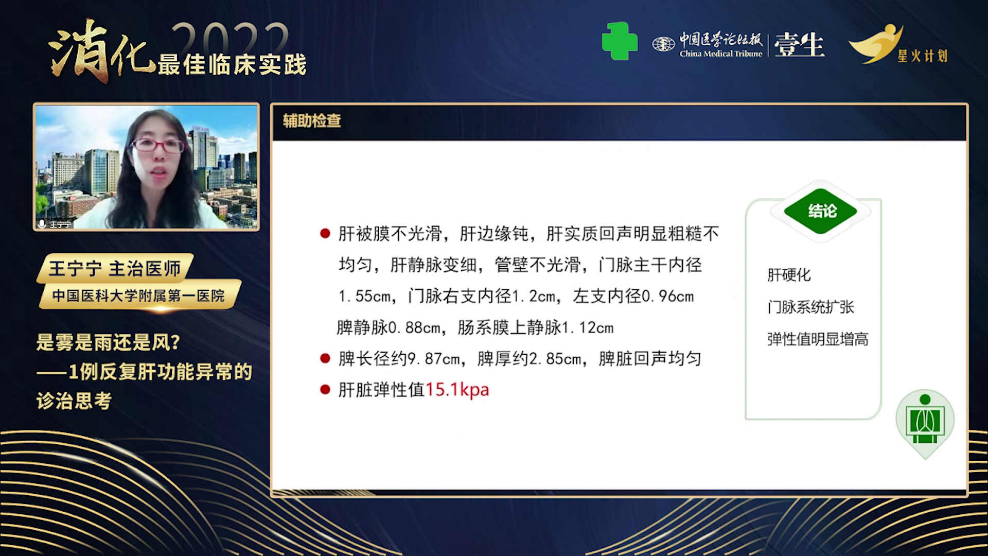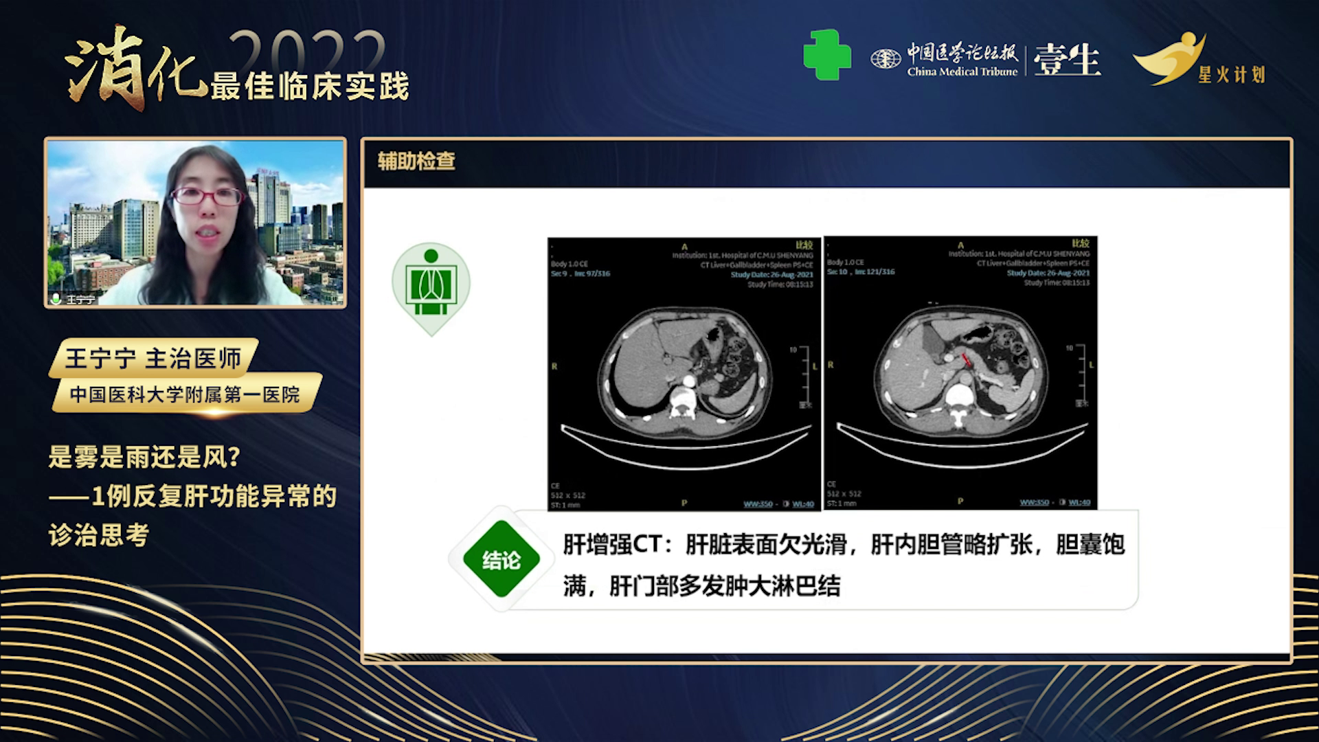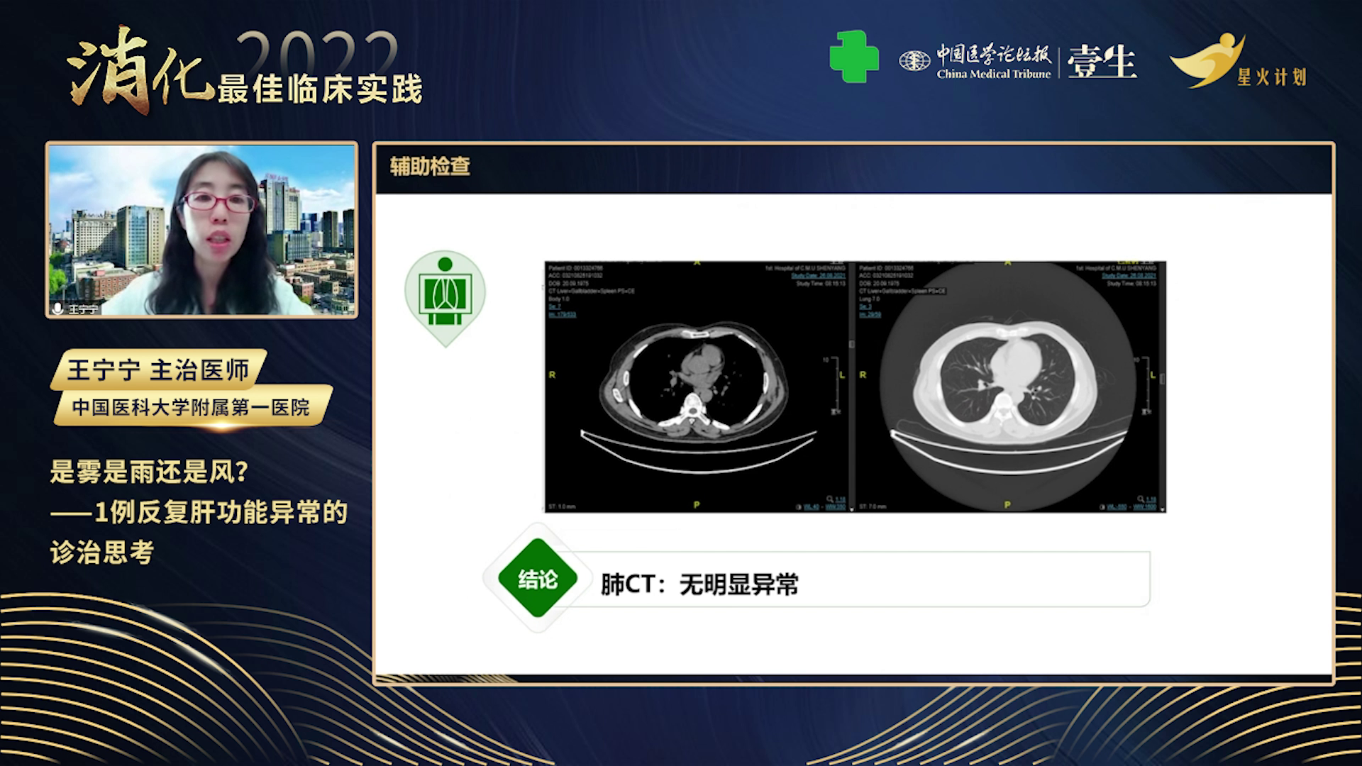 2015年12月就诊于我院,复查肝功能:ALT 254 U/L,AST 93 U/L,ALP 526 U/L,GGT 1071 U/L,胆红素正常,IgG轻度增高19.9 g/L,ANA 1:80阳性,MRCP提示肝左叶肝内胆管轻度扩张,考虑自身免疫性胆管炎,予熊去氧胆酸、异甘草酸镁等保肝治疗,10天后复查肝功能明显好转,谷丙转氨酶及谷草转氨酶降至正常,碱性磷酸酶和γ-GT降约一半,胆红素正常,之后继续熊去氧胆酸口服出院。2016年因肝功能异常于北京某医院住院,肝穿提示免疫相关性胆管炎,但未找到报告,北京医院建议继续熊去氧胆酸口服,此后肝功能仍异常。2018年于我市某医院复查,四个转氨酶均增高,ANA 1:80阳性,ANCA阳性,IgG及IgM正常,再次肝穿仅提示慢性炎症性改变(G1/S0-1),局灶可疑具有不典型的重叠综合征(PBC与AIH),建议尝试激素治疗,患者拒绝,仍继续熊去氧胆酸0.25g tid口服,此后多次复查肝功仍异常。直至2021年8月25日,因肝功能持续异常(ALT 78U/L,AST 77U/L,ALP 271U/L,GGT 387U/L)再次就诊于我院消化内科住院治疗。病来有乏力,间断大便不成形,便次增多至3-4次/日,无黏液脓血及明显腹痛,精神、饮食、睡眠正常,体重无明显变化。