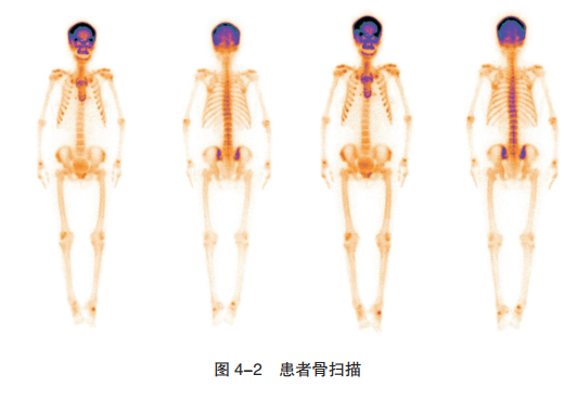 行全身骨ECT检查(图4-2):全身骨显像符合“代谢性骨病”图像特点,考虑不除外甲状旁腺功能亢进、成人骨软化症?进一步行甲状腺超声检查:甲状腺右叶多发结节,甲状腺影像报告和数据系统(TIRADS)3类,未见异常甲状旁腺,查甲状旁腺素1169 pg/ml,明显升高。