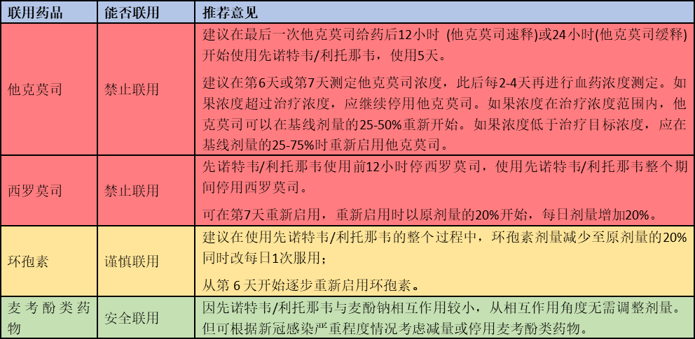 对于正在服用免疫抑制剂的新冠感染患者,需要使用先诺特韦/利托那韦时,需调整与利托那韦有明显相互作用的免疫抑制剂的剂量,主要包括他克莫司、环孢素、西罗莫司;而麦考酚类药物不需要进行剂量调整(详见用药建议)。先诺特韦/利托那韦疗程结束后,建议在2周内对这类免疫抑制剂进行严密血浓度监测,并用于指导剂量调整。具体用药建议如下: